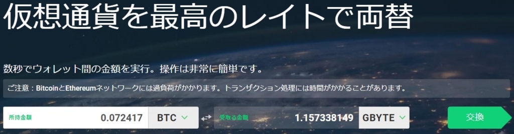 この左の部分に自分が交換したい仮想通貨を入力すると、自動で交換量が表示されるので、「交換(change)」を押して量を確認したら「次へ(next)」を押す。ここで自分のByteballウォレット(後述)の受取アドレスを入力して「次へ(next)」を押す。そこで表示された送金先アドレスに自分のBTCなどの仮想通貨を振り込む。しばらくするとByteballが手に入る。僕は少し不安だったので少額で試してから本番の金額を試したが、両方ともすんなり上手くいった。